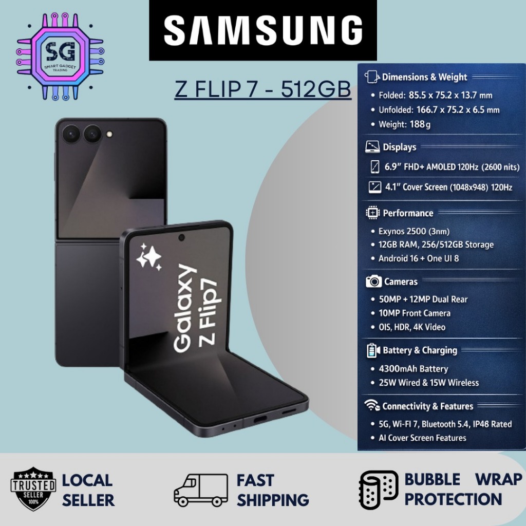 ✅ Summary: The Galaxy Z Flip 7 [12GB+512GB] is Samsung’s premium clamshell foldable with a large inner display, full-edge cover screen, strong performance, modern cameras, and long software support — ideal for users who want flagship flexibility in a compact form factor.