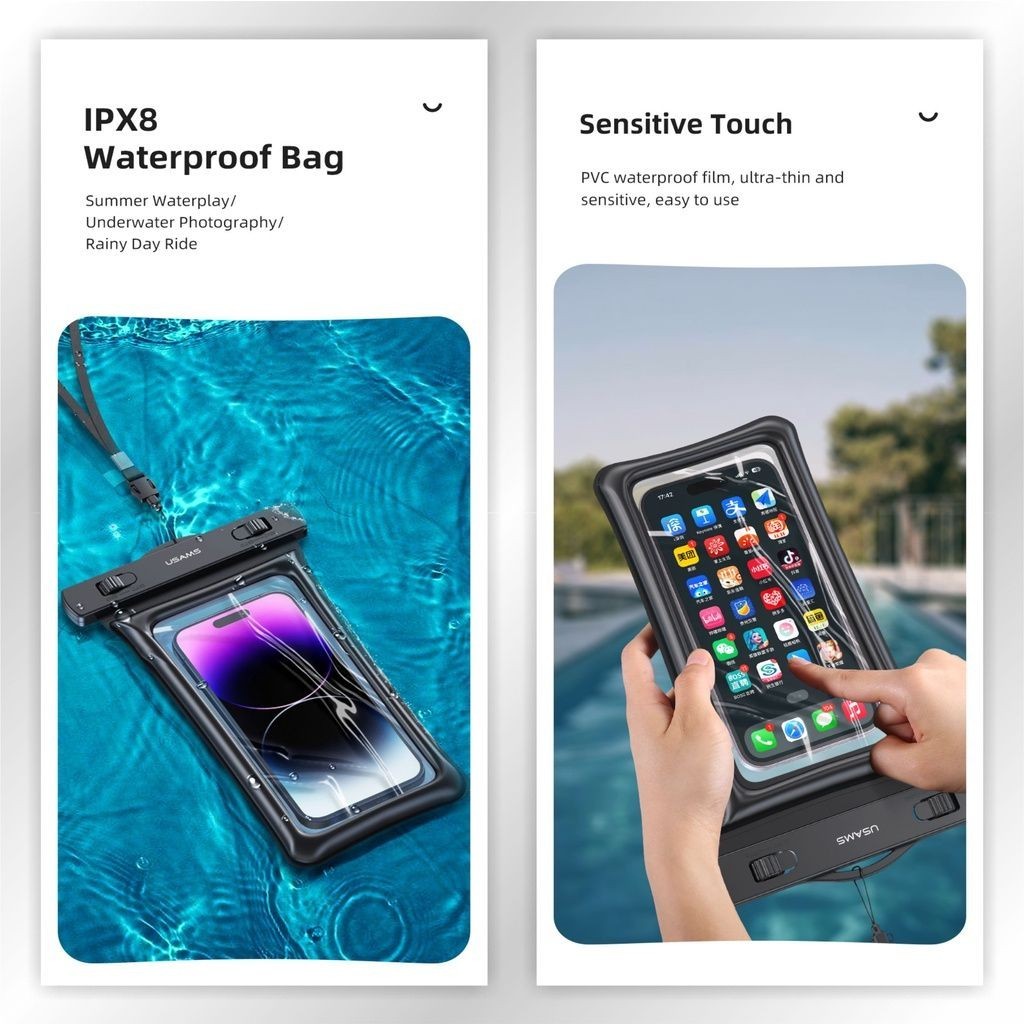 [Floating Waterproof Phone Case] The airbag around the pouch keeps your cell phone afloat. For some large-screen mobile phones, we recommend a slim protective case or no case at all for optimal floatability. Make sure this waterproof bag is tightly sealed before underwater use. [IPX8 Waterproof Phone Pouch] Simply to remove the case by switching the secure lock seal on the top. IPX8-rating for depths up to 100ft, Thee Waterproof case promises to keep your phone dry and accessible. [Highly Sensitive Dry Bag] Premium TPU material makes it easy for a friendly screen-touch, transparent waterproof window enables you to take good quality pictures and videos underwater. [Universal Waterproof Case] Compatible with most Smartphone Below 6 inches. Perfect for surfing, swimming, diving, skiing, boating or other activities